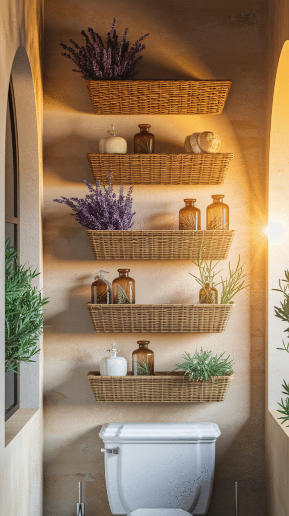 I added floating wooden shelves above the toilet once, and it turned into both decor and function. Pretty baskets hide the chaos, while a candle or two makes it Instagram-worthy.