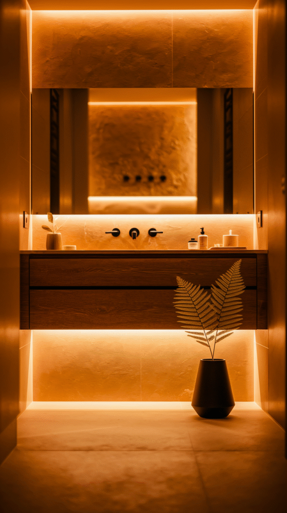- Add under-cabinet LED strip lighting for that “hotel bathroom” glow.