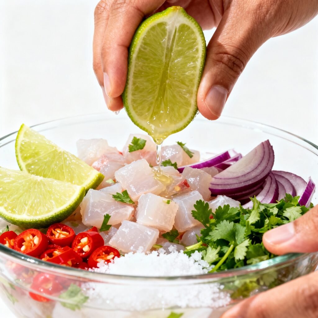3. Marinate with Lime Juice: Pour the freshly squeezed lime juice over the fish, ensuring that all the pieces are submerged. Gently stir to coat.