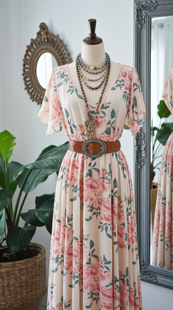 9. Maxi Dress + Statement Belt + Layered Jewelry
