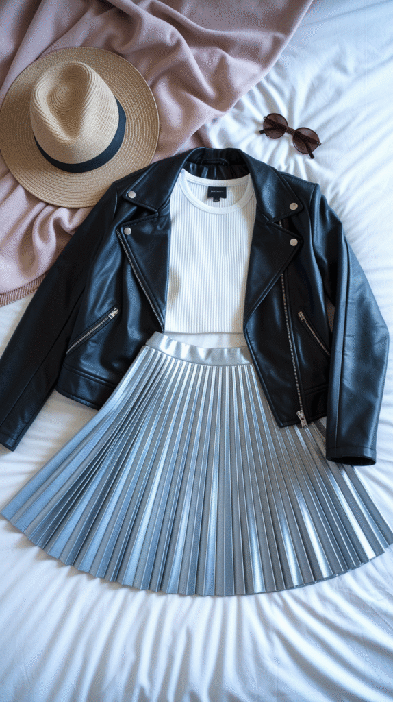 7. Metallic Skirt + Crop Top + Leather Jacket