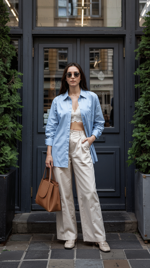 A baby blue button-down is the unsung hero of chic. It says “I have my life together,” even when you don’t. Pair it with wide-leg trousers (cream, beige, or gray = chef’s kiss).