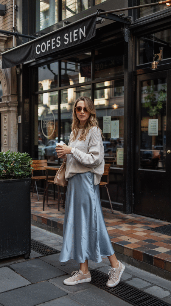 The blue satin skirt is giving “I’m romantic, but also practical.” Pair it with a chunky knit sweater and suddenly you’re chic in that effortless “I didn’t even try” way (even though you definitely stood in front of your mirror for 20 minutes).