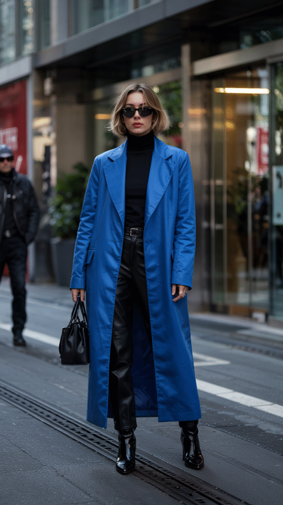 When in doubt, let your coat do the talking. A bold blue coat over an all-black outfit is literally the easiest way to look expensive. It’s giving “I just landed from Paris” energy, even if you’re just headed to Starbucks.