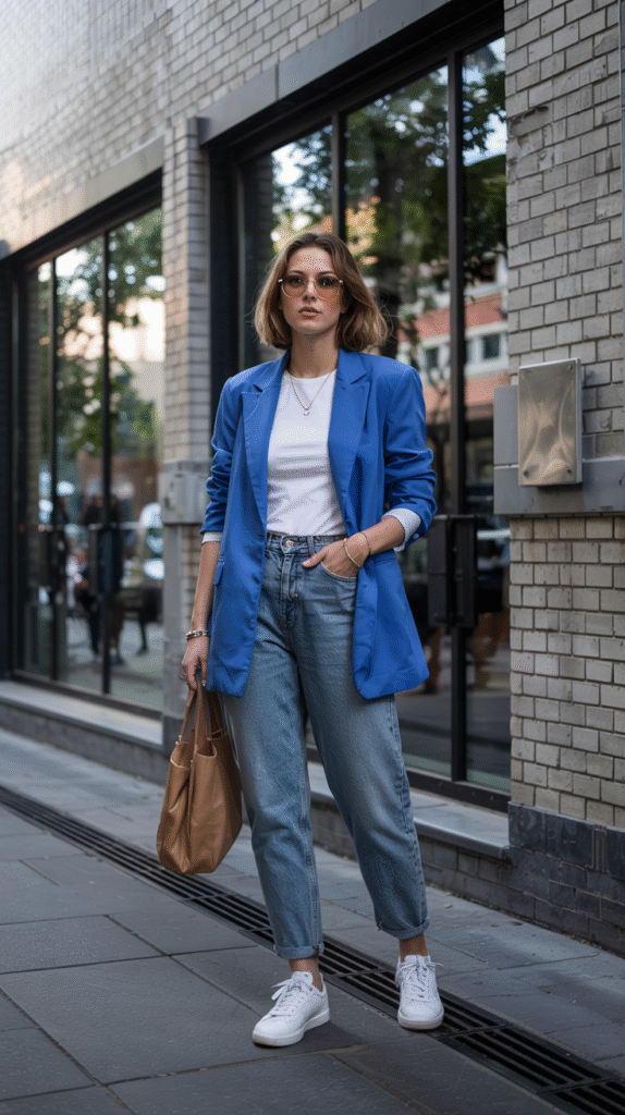 A blue blazer is basically the BeyoncĂ© of outerwear: powerful, timeless, and makes everything better. Toss it over a white tee and jeans, and suddenly you’re giving “I have a meeting, but also cocktails at 6.”