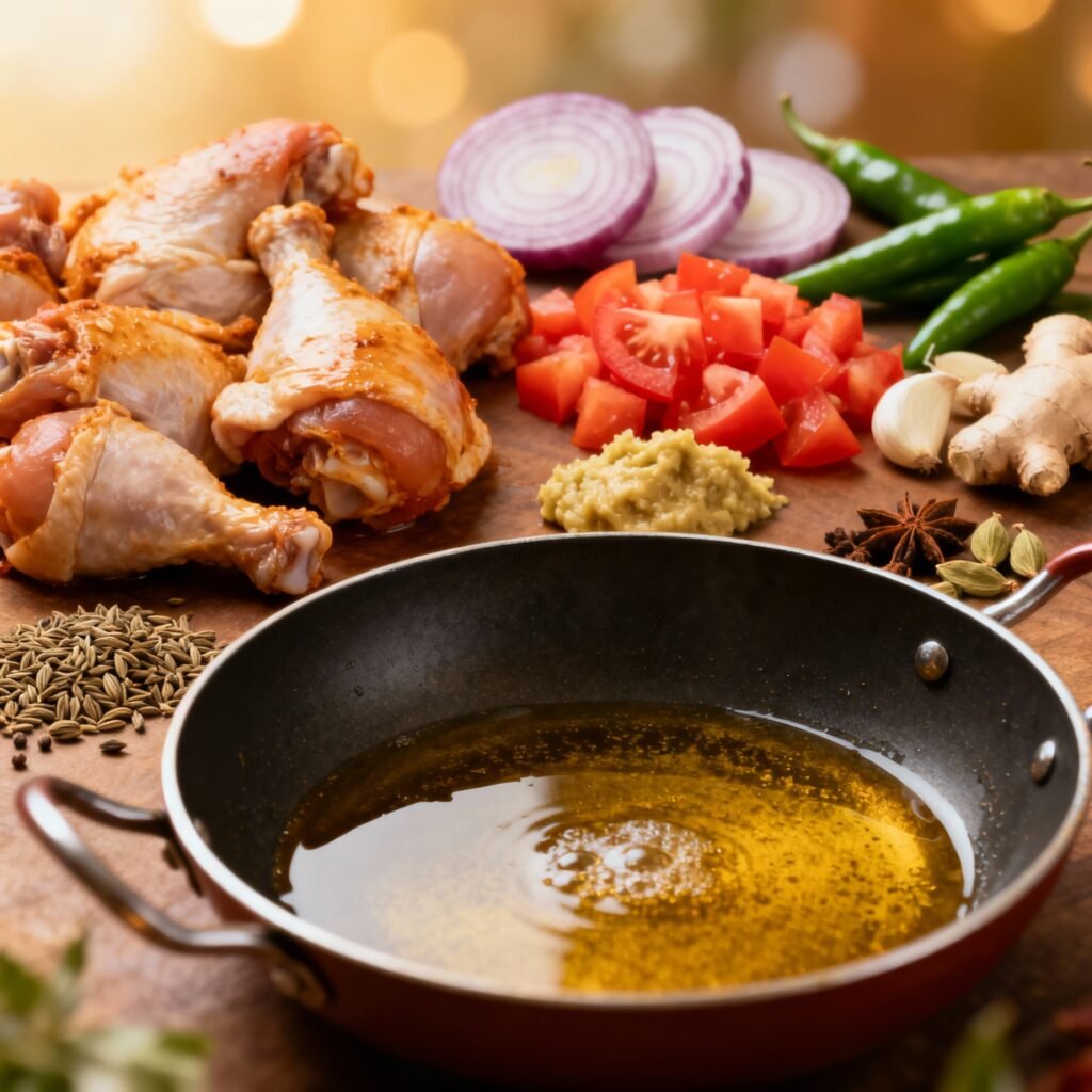- Add the Chicken: Add the marinated chicken pieces to the kadai and cook until they are browned on all sides, about 5-7 minutes.