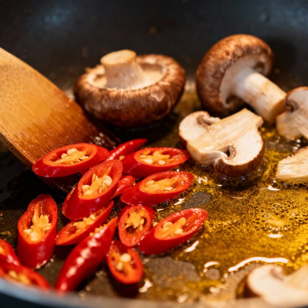 - Add the Chilies: Add the chopped fresh chilies to the wok and sauté for another 30 seconds, allowing the flavors to infuse into the oil.