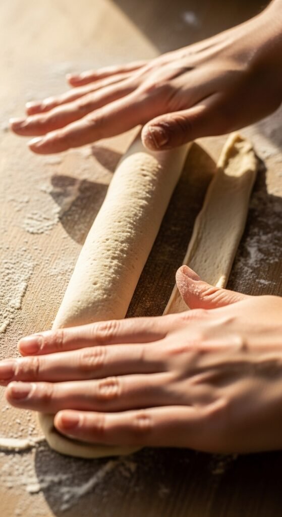 Cut the dough into long strips, around ½–1 inch wide. No need for perfect lines. We’re baking, not doing geometry.