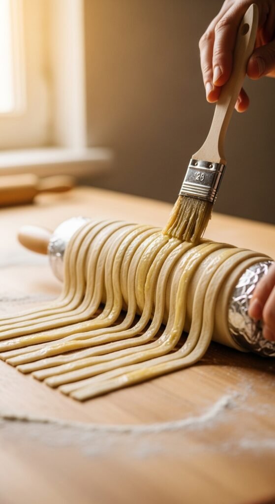 Spiral the dough around your foil-wrapped can or rolling pin. Slightly overlap each strip so it bakes into a seamless cylinder. Roll it gently on the counter to smooth it out.