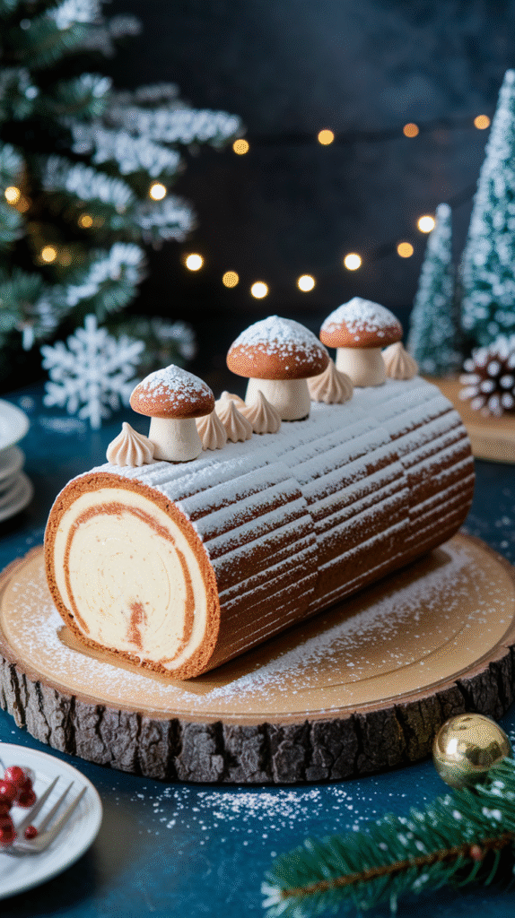This one screams “holiday centerpiece.” A Yule log cake (aka Bûche de Noël) is rolled sponge cake filled with cream, frosted to look like a log, and decorated with powdered sugar “snow.”