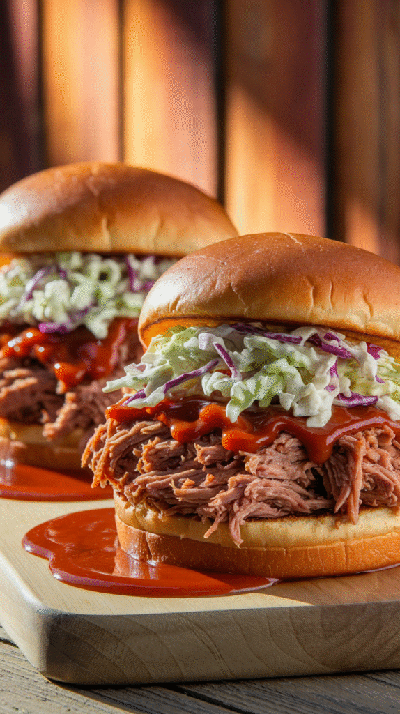 1. Slow-cook pork with onions and BBQ sauce until it falls apart.
