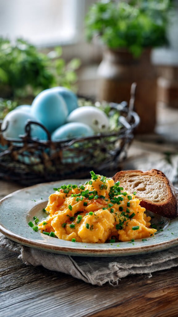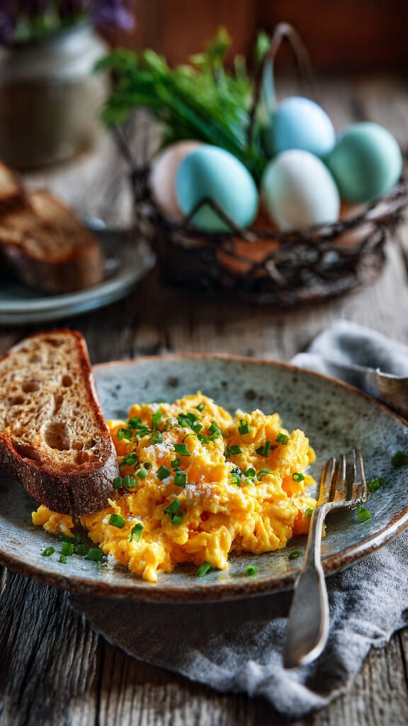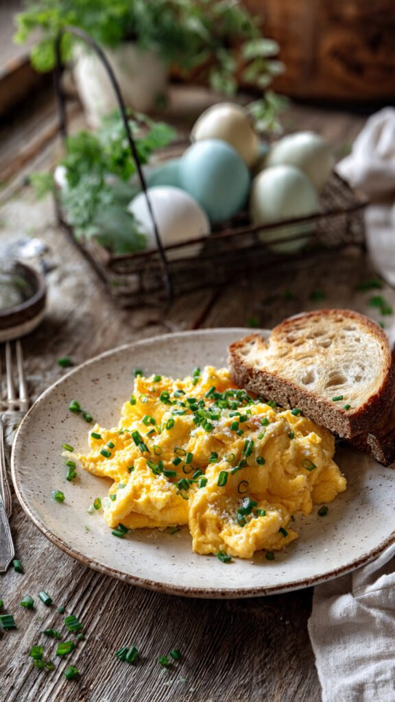 7. Plating Slide those gorgeous, silky folds onto your buttered toast. Sprinkle generously with the chopped chives, a few turns of black pepper, and that flaky salt.