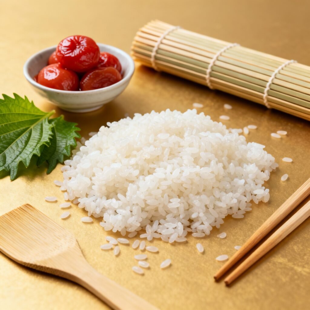 - Prepare the Rice: Cook the Japanese short-grain rice according to the package instructions. Once cooked, fluff the rice gently with a rice paddle or fork. Lightly sprinkle with a pinch of salt and mix well. Allow the rice to cool slightly until it’s warm but not too hot to handle.