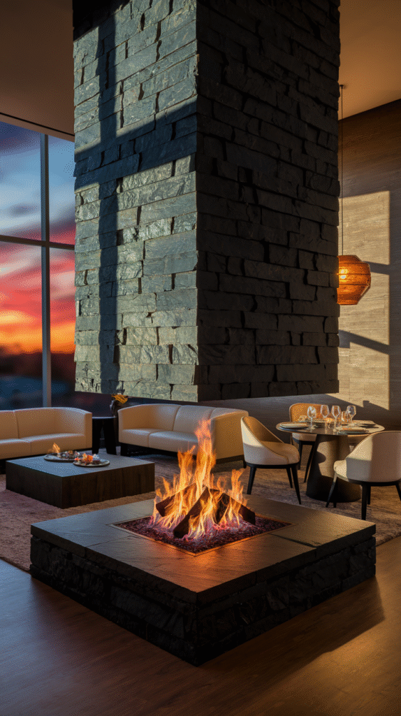 Double-sided fireplaces are perfect if you like open layouts but still want some cozy separation. Just don’t install one between your kitchen and bathroom. Trust me on that.