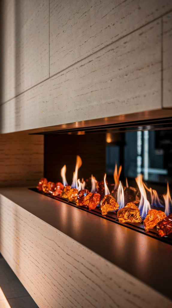 Pair a linear fireplace with glass rocks instead of logs. It gives a chic, high-end vibe without trying too hard.