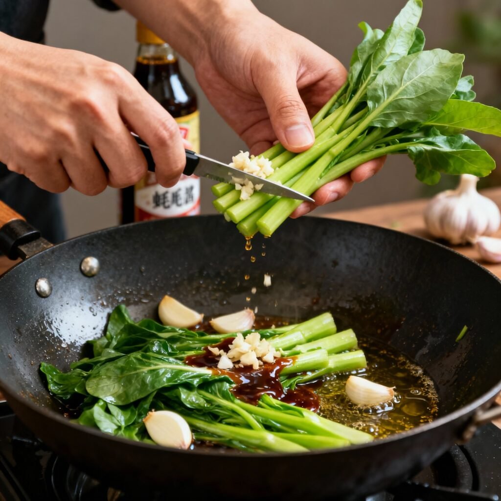 - Add Sauce: Pour the prepared sauce over the gai lan and stir-fry for another minute, until the sauce thickens slightly and coats the vegetables evenly.