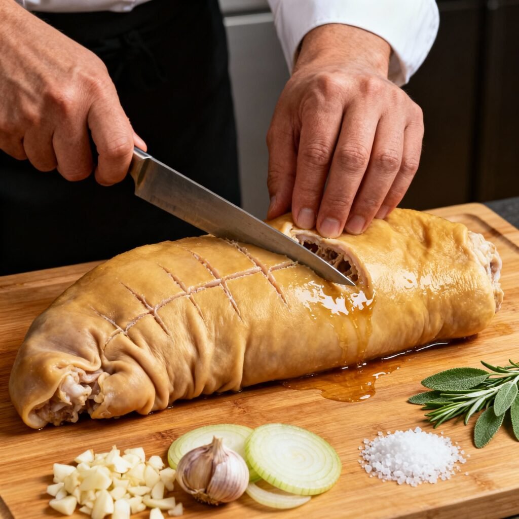 - Remove and Slice: Carefully remove the hog maw from the pot and let it cool slightly. Remove the kitchen twine or skewers. Slice the hog maw into thick slices.