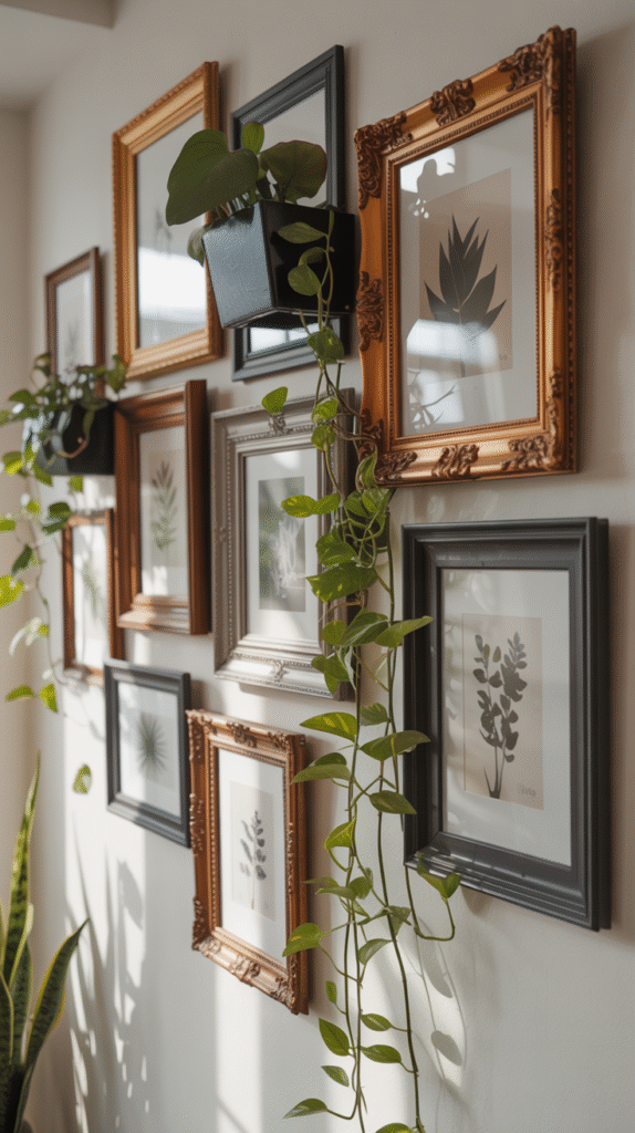 • Accent Lighting: Small picture lights or LED strips above frames add a pro look.