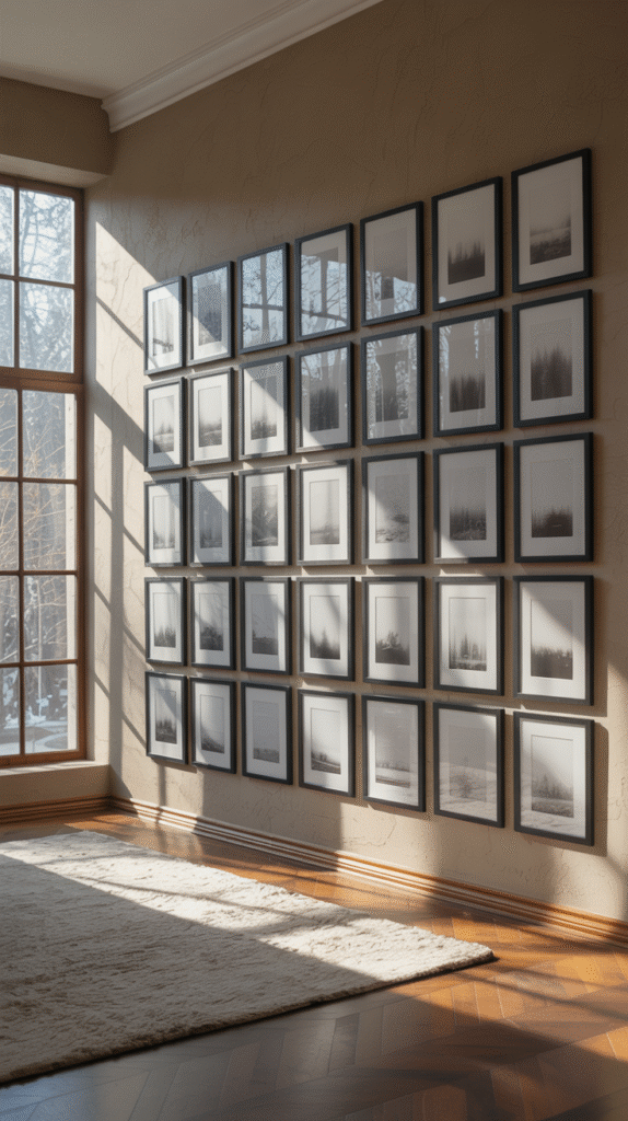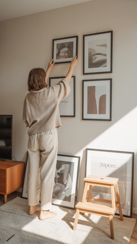 Quick Hack: Cut out paper templates the size of your frames and tape them to the wall. You’ll instantly see how the arrangement feels before making a single hole.
