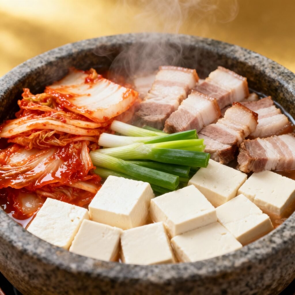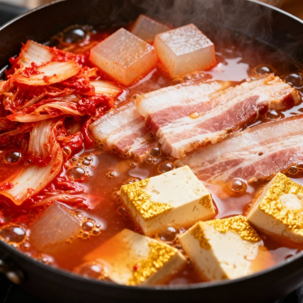 • Doenjang (Korean Soybean Paste): A touch of doenjang adds umami and complexity to the broth, balancing the sourness of the kimchi and the richness of the pork.