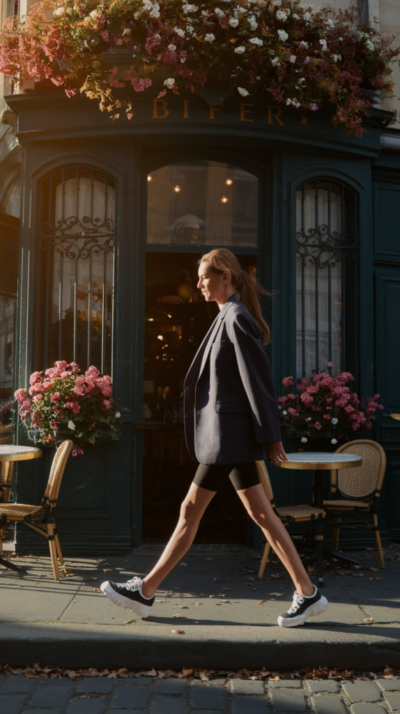 You know those paparazzi pics of models going to lunch looking impossibly cool? That’s the vibe. Think oversized blazer, biker shorts, and chunky sneakers. Add some tiny sunglasses if you dare.