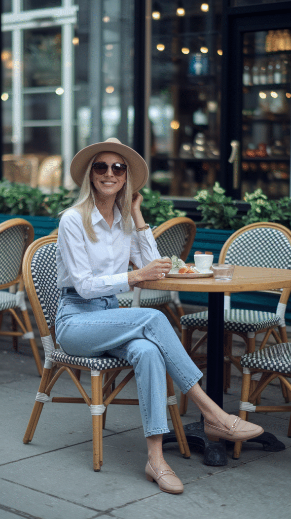 Picture this: high-waisted jeans, a tucked-in white button-down shirt, and loafers. Add a belt, maybe some gold hoops, and suddenly you’re giving off “I woke up like this” vibes.