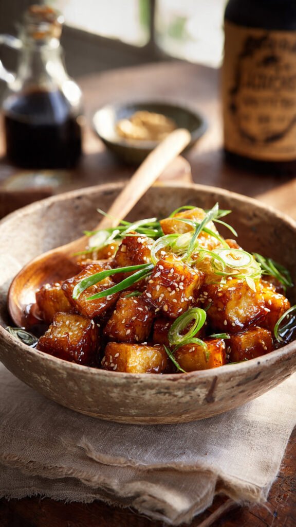 Toss the crispy tofu back into the pan. Stir quickly to coat every nugget in that thick, savory glaze. Turn off the heat immediately so the tofu stays crisp. Top with scallions and sesame seeds. Serve immediately.
