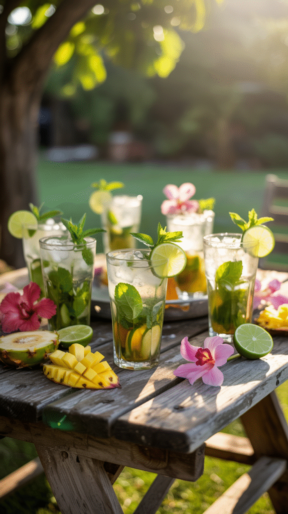 Crushed ice, fresh mint sprig, lime wheel, and maybe a striped straw. Bonus points if thereâs sunlight, a tropical backdrop, or a beach towel in the shot.