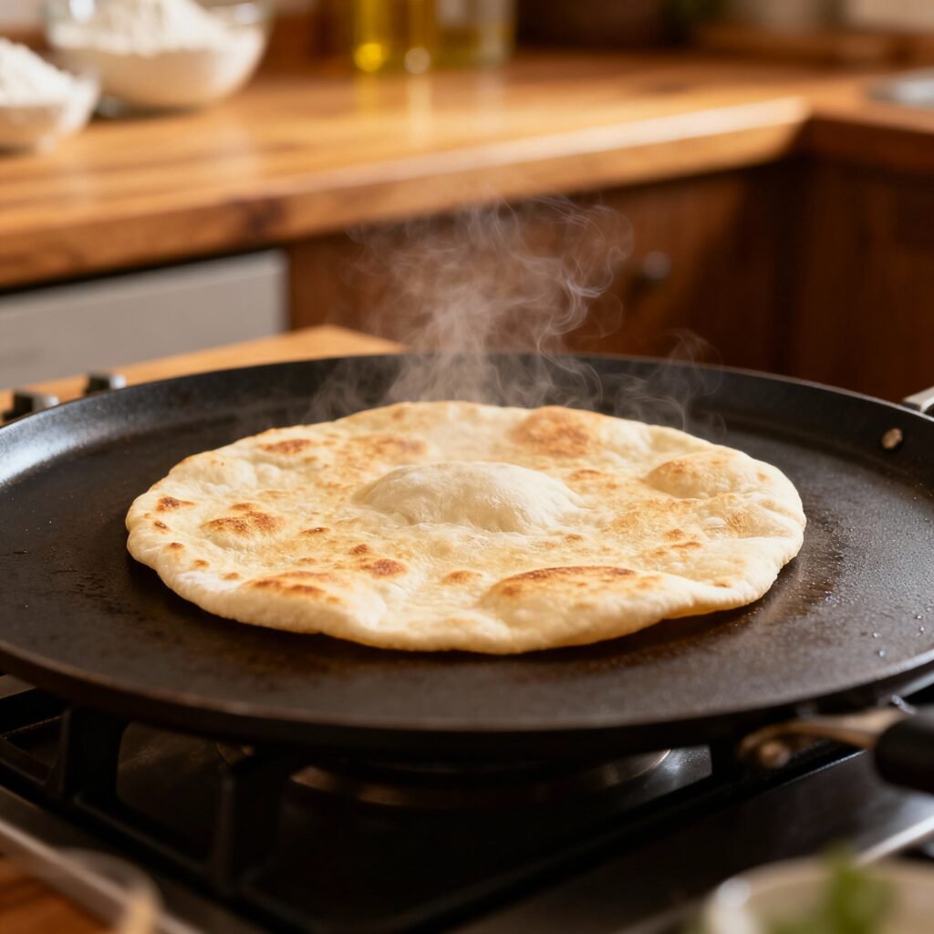 - Cook the Nan Roti: Heat a cast iron skillet or griddle over medium-high heat until very hot. You can also use a pizza stone in the oven preheated to 500°F (260°C).
