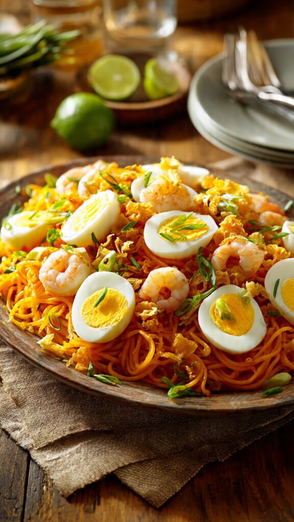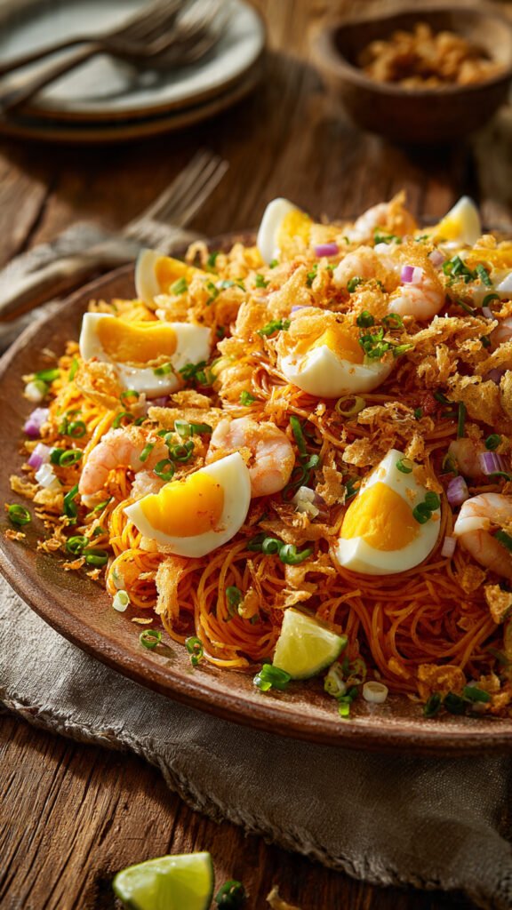 If you’ve never had it, imagine delicate rice noodles smothered in a rich, savory, bright orange shrimp sauce, and then absolutely buried under an avalanche of crunchy pork rinds, smoky fish flakes, hard-boiled eggs, and snappy shrimp. It’s a fiesta on a plate. It’s traditionally served at Filipino celebrations, but hey, surviving a Tuesday is cause for celebration enough, right?