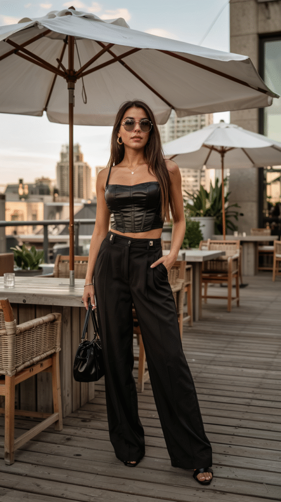 If jeans feel too casual but dresses feel too extra, this is the look. Wide-leg trousers give you that polished vibe, and a corset or bustier top keeps it party-appropriate.