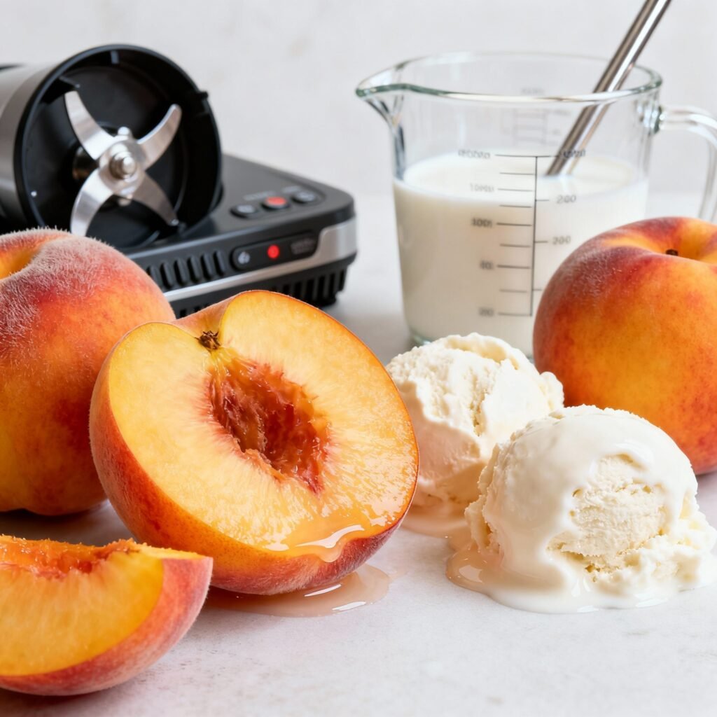 - Combine Ingredients: Place the sliced peaches, vanilla ice cream, and 1/4 cup of milk into a blender.