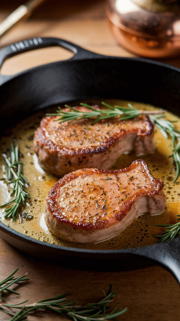 - Sear pork chops 3–4 minutes per side until golden brown. Remove from skillet.