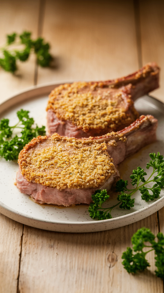 - Heat oil in skillet, fry chops 3–4 minutes per side until golden and crispy.