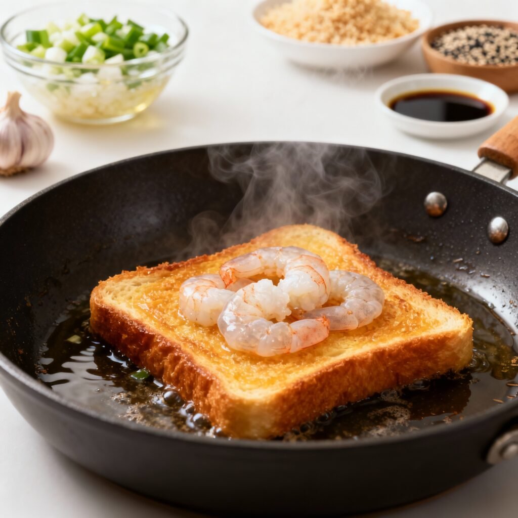 - Fry the Prawn Toast: Carefully place the prawn toast pieces, prawn-side down, into the hot oil. Do not overcrowd the pan; fry in batches if necessary.