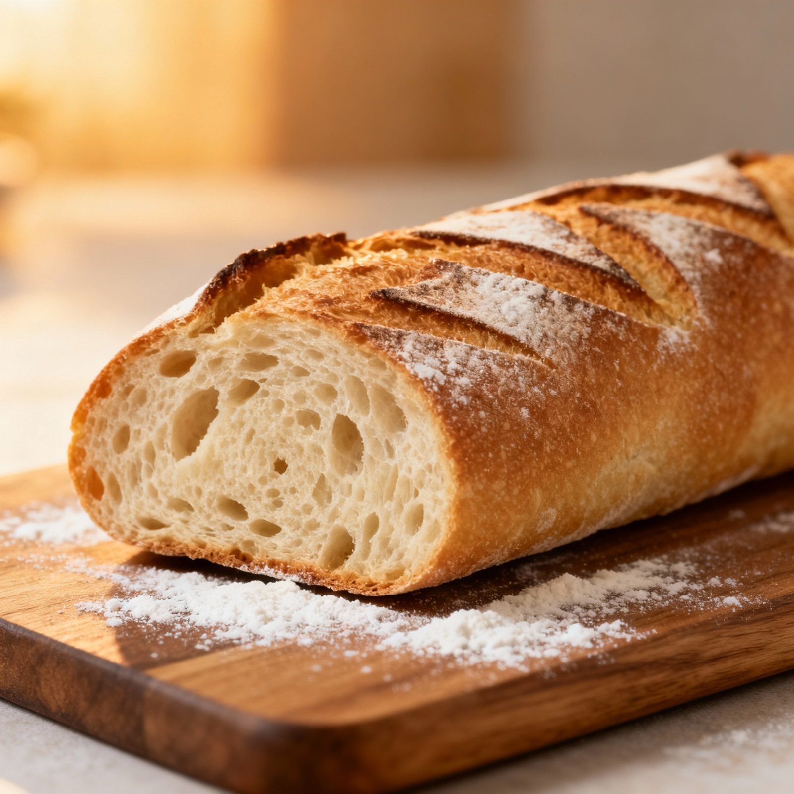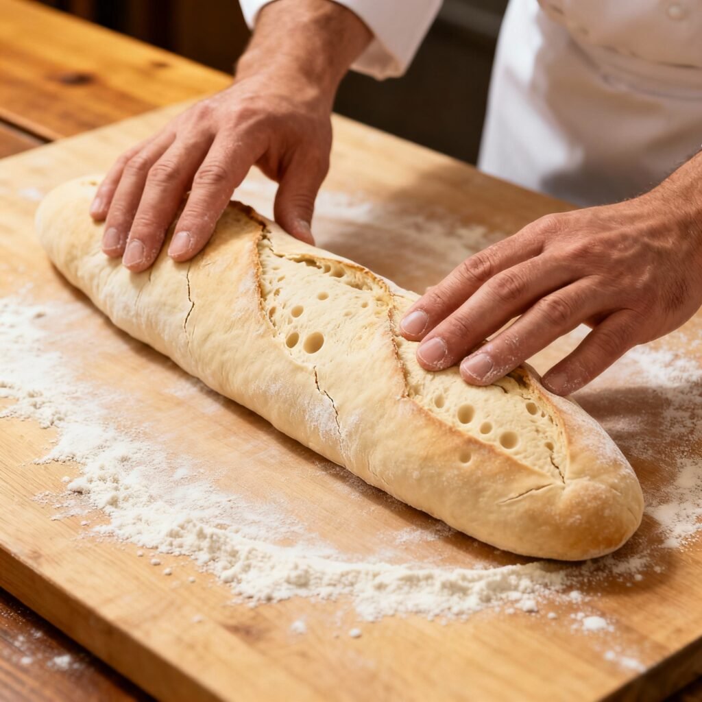 - High Hydration Dough: A higher water content (hydration) creates a more open crumb structure and that classic baguette chewiness.
