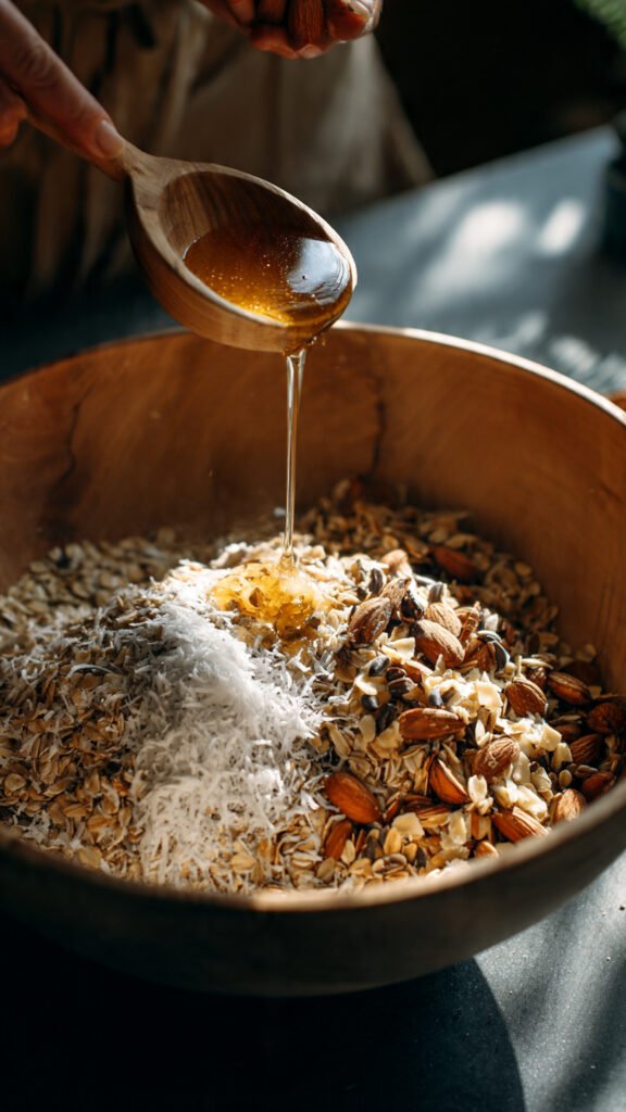 Pour in honey/maple syrup, coconut oil, and vanilla. Stir until everything looks shiny and evenly coatedâlike your oats just got moisturized.