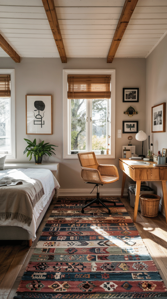 I once used a bold striped rug in my small bedroom, and suddenly it looked like I had a whole “living area.” Bonus: rugs make rooms feel cozy even if your floor is kinda ugly.