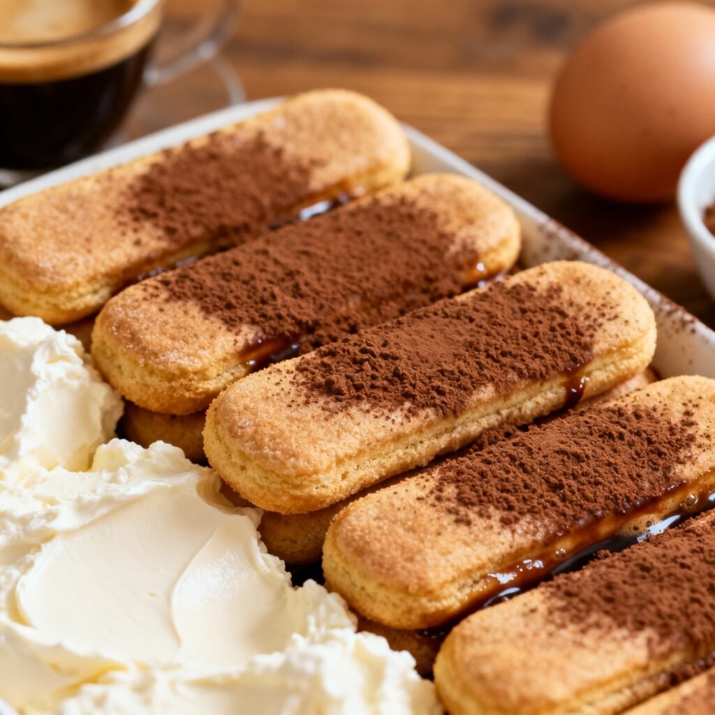 - Assemble the Tiramisu: Arrange a layer of coffee-soaked ladyfingers in the bottom of your serving dish (a 9×13 inch baking dish or individual ramekins work well).