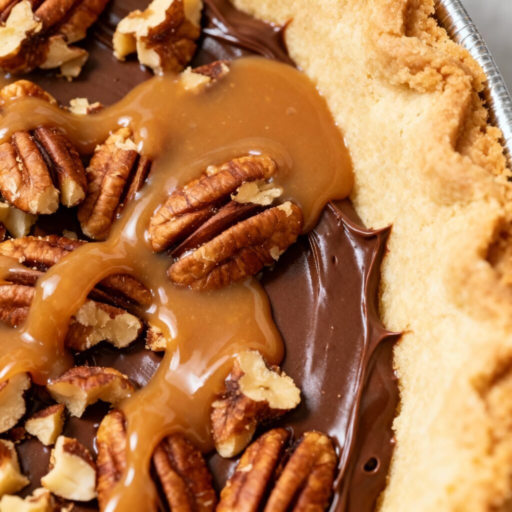 - Prepare the Caramel Layer: In a small bowl, combine the caramel sauce with half of the chopped pecans (1/2 cup).