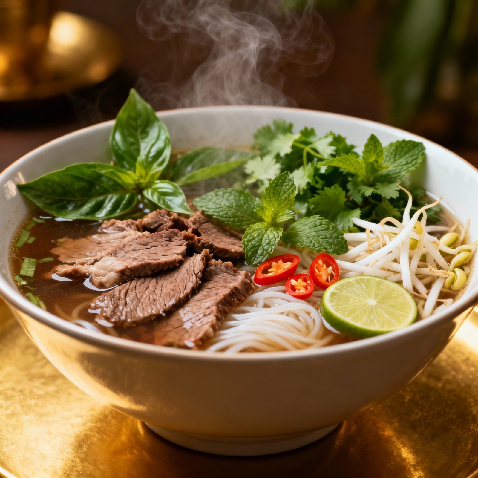 - Garnish and Serve: Garnish each bowl of Pho with fresh cilantro, Thai basil, bean sprouts, green onions, lime wedges, and jalapenos (if desired). Serve immediately with hoisin sauce and sriracha sauce on the side for dipping.