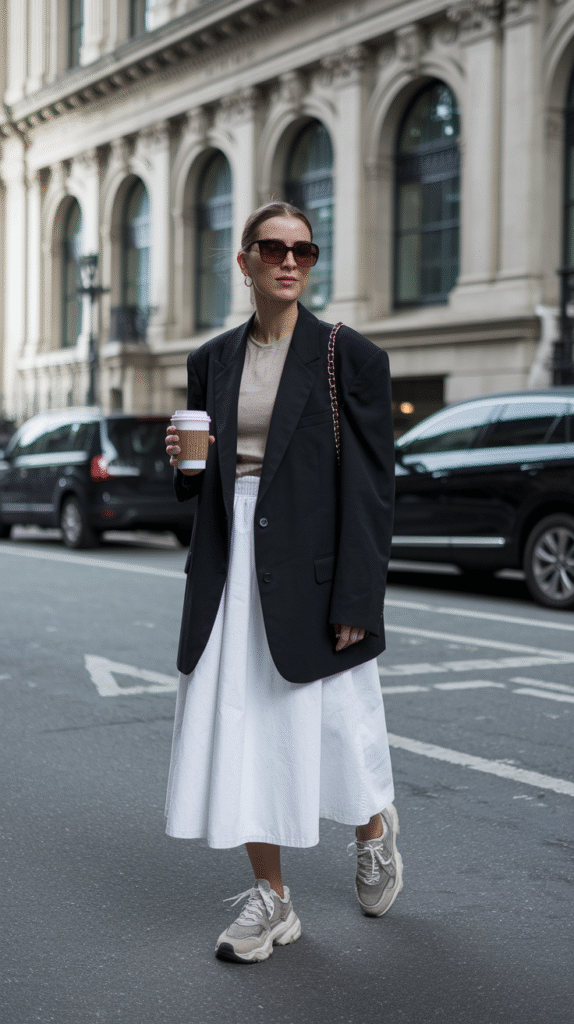 Okay, hear me out: blazers don’t have to mean stiff corporate vibes. Pair an oversized blazer with your white skirt and throw on chunky sneakers. Boom. You’re instantly channeling street-style star energy.