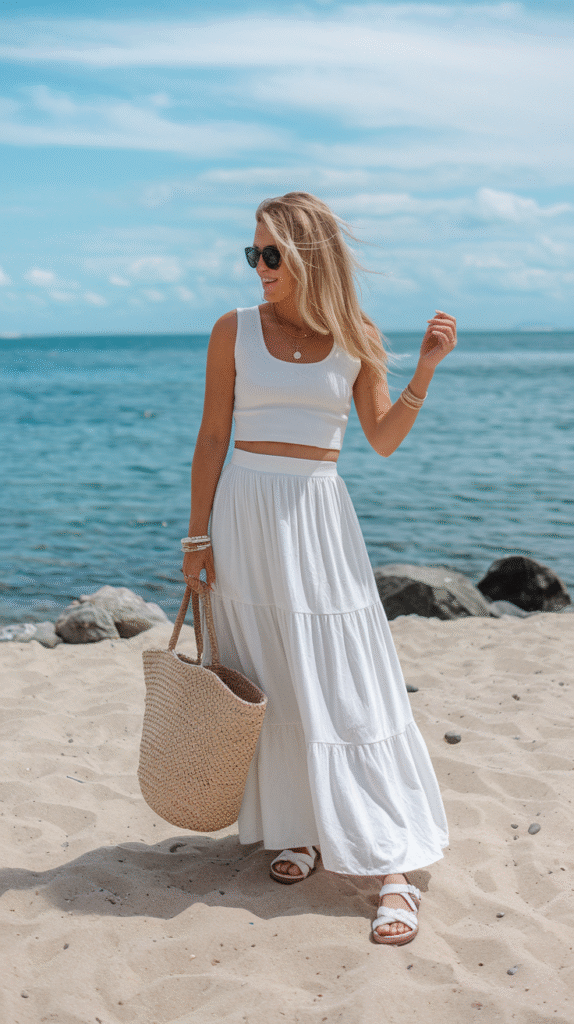 For that boho goddess vibe, a flowy white maxi skirt with a fitted crop top is unbeatable. Add strappy sandals, oversized sunnies, and a woven tote, and suddenly you’re on vacation—even if you’re just at Trader Joe’s.